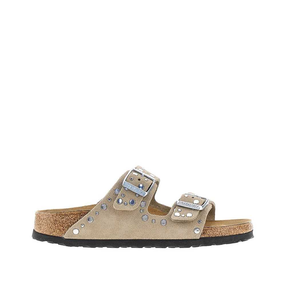 Ciabatte Arizona realizzate in morbida pelle scamosciata, decorate con rivetti in metallo argentato. Doppio cinturino regolabile con fibbia in metallo con logo impresso. Plantare anatomico in pelle scamosciata. Base in sughero. Suola in gomma. Calzata stretta.