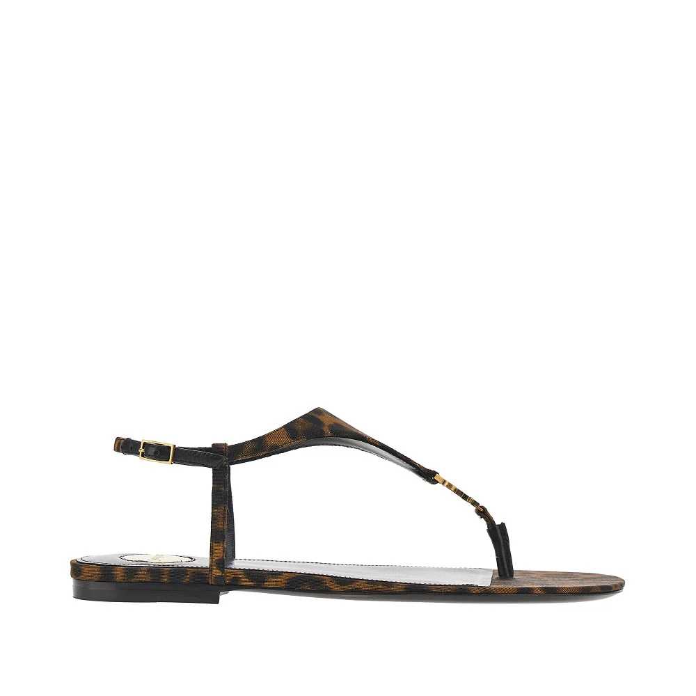 Sandali infradito realizzati in gros-grain con motivo leopardato, arricchiti dal dettaglio Cassandre in metallo finitura oro anticato. Cinturino regolabile alla caviglia con inserto in pelle e fibbia in metallo. Fodera e sottopiede in pelle. Suola in cuoio con intarsio in gomma sul tacco.