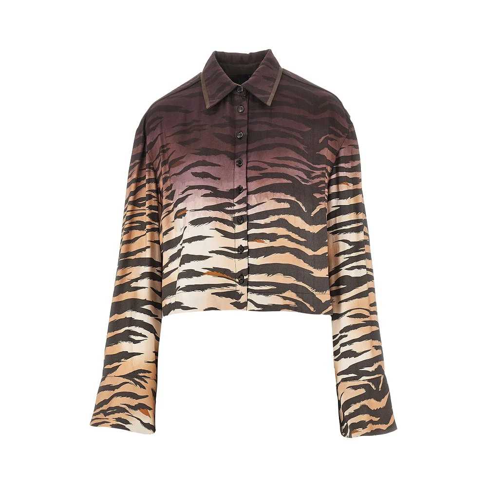 Camicia cropped realizzata in twill di viscosa con stampa animalier. Chiusura con bottoni, colletto classico a punta con finitura in satin e ampie maniche lunghe. Vestibilità rilassata.