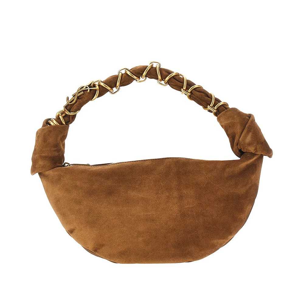 Borsa hobo realizzata in morbida pelle scamosciata. Manico da portare a mano o a spalla con nodi alle estremità, catena intrecciata e dettaglio Cassandre in metallo finitura oro anticato. Chiusura con zip. Fodera in tessuto.
