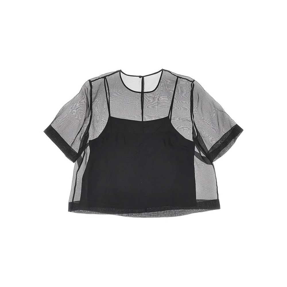 Top a manica corta realizzato in organza di seta trasparente, dotato di top interno separato in twill di viscosa con spalline sottili. Taglio cropped e silhouette a trapezio. Girocollo e chiusura a goccia con bottoncino in madreperla sul retro.