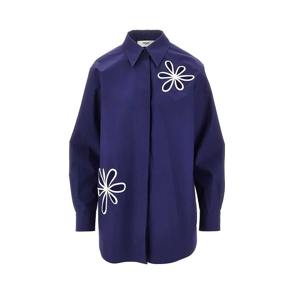 Camicia realizzata in popeline di cotone, arricchita dal motivo Fendi Ajour cut-out rifinito con profili a contrasto. Chiusura con bottoni a scomparsa, colletto a punta, polsini con bottone e fondo capo stondato. Logo lettering ricamato tono su tono sul polsino sinistro. Taglio dritto e oversize.
