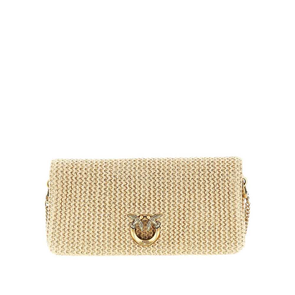Pochette in rafia sintetica intrecciata, arricchita dal dettaglio Love Birds Diamond Cut in metallo. Patta con bottoni magnetici. Tracolla rimovibile e regolabile in pelle e catena. Tasca a fessura sul retro. Fodera in gabardine e tasca interna con zip. Dettagli in metallo con finitura oro anticato.