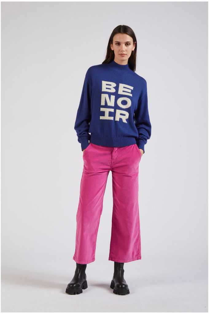 Maglia con collo tipo ciclista realizzata in un caldo e soffice filato misto angora. la maglia riproduce il nostro slogan "be noir" in colore a contrasto. una delicata linea di strass incornicia la scritta.