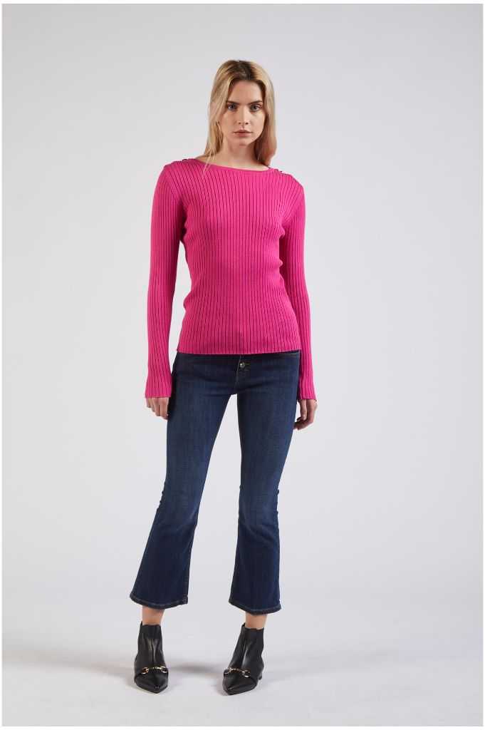 Maglia girocollo con maniche lunghe realizzata in un filato di viscosa con lavorazione a costa. placchette personalizzate alle spalle.