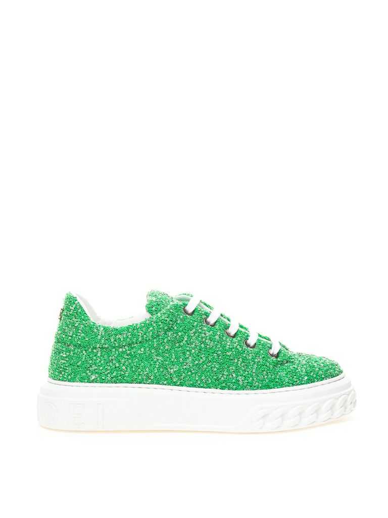Sneaker Verdi Casadei Off Road Disk. Allacciatura con lacci bianchi, suola in gomma bianco con catena a bassorilievo e logo stampato sul retro. Tomaia in tessuto verde topazio di maglia con paillettes applicate all over. Altezza suola: 4 cm-Sku interno:24AP176Nessuna informazione disponibile