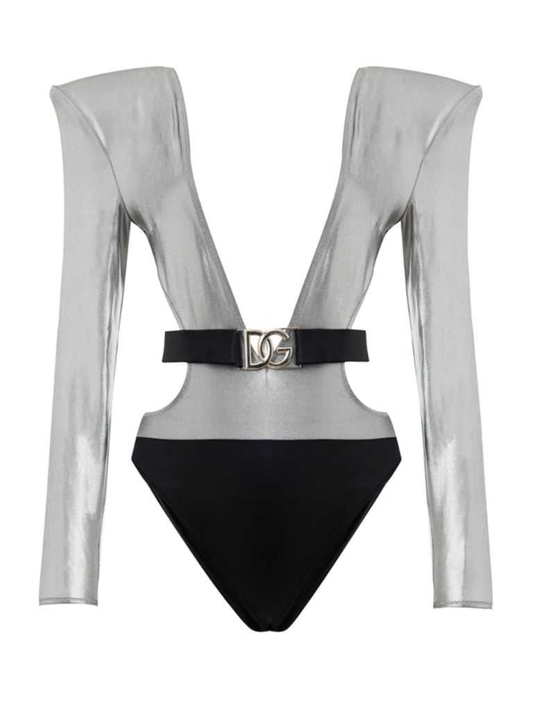 Costume Maniche Lunghe Silver Dolce & Gabbana. In silver e nero, maniche lunghe, spalline imbottite, scollo profondo, cintura elasticizzata con logo removibile. Taglia 2=XS o 36ITComposizione: 55% Viscosa, 25% Elastane, 20% PoliammideSKU Interno: 25GIU17SKU Brand: O9CO3JONM51S1006Nessuna informazione disponibile