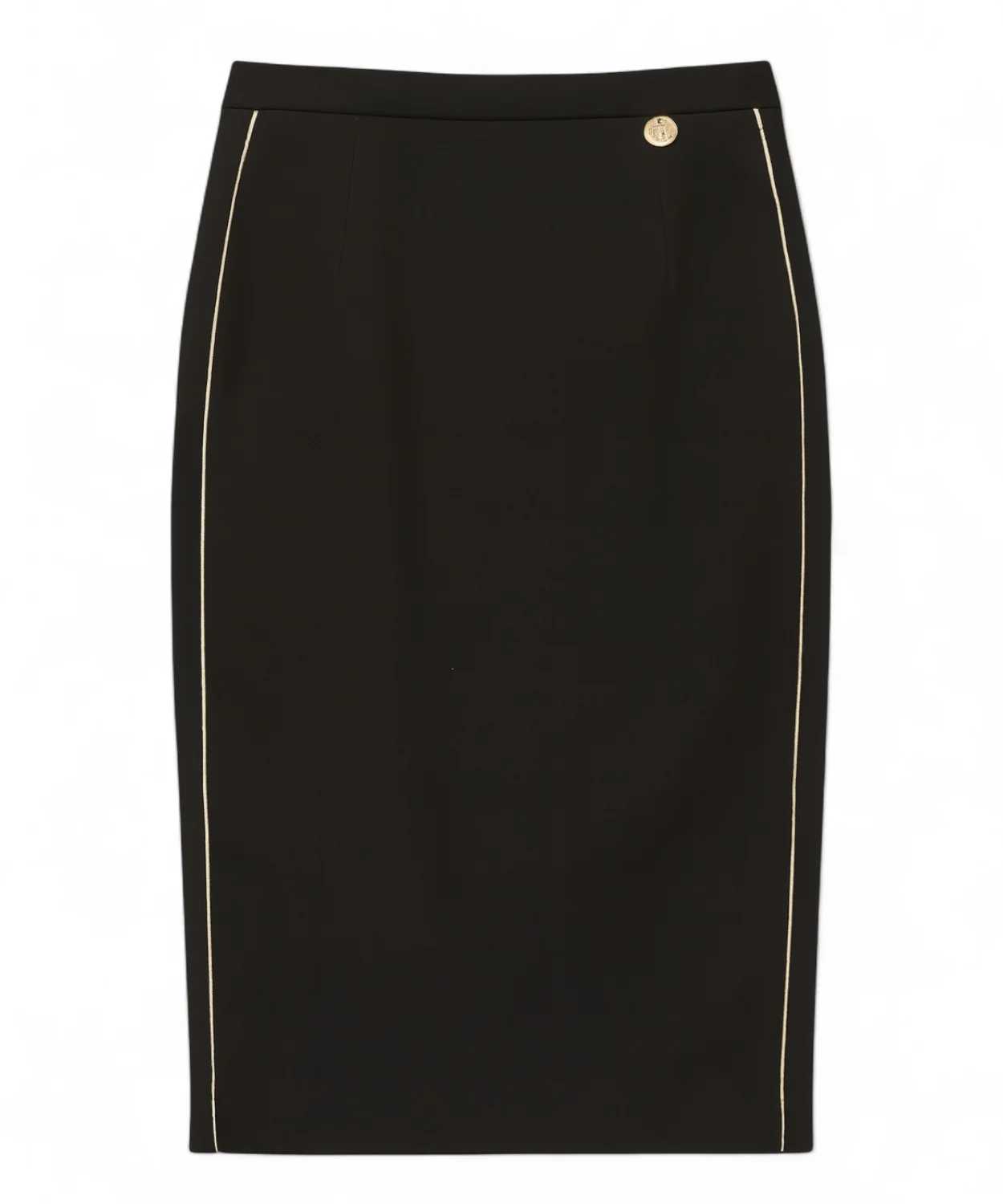 La gonna tubino Tuwe con bande laterali sottili è un capo raffinato ed essenziale, pensato per valorizzare la silhouette con una linea pulita e moderna.Realizzata in tessuto strutturato di alta qualità, offre una vestibilità impeccabile che accompagna le forme senza segnare, rendendola ideale per outfit eleganti da ufficio, cerimonie o serate speciali. Il design minimal è arricchito dalle bande laterali sottili a contrasto, che slanciano otticamente la figura e aggiungono un tocco sofisticato.In vita, un bottone gioiello discreto completa il capo con un accento luminoso e femminile. La lunghezza al ginocchio e la vestibilità regolare la rendono un capo versatile, perfetto da abbinare a camicie, bluse, maglioncini o blazer coordinati per creare look impeccabili.