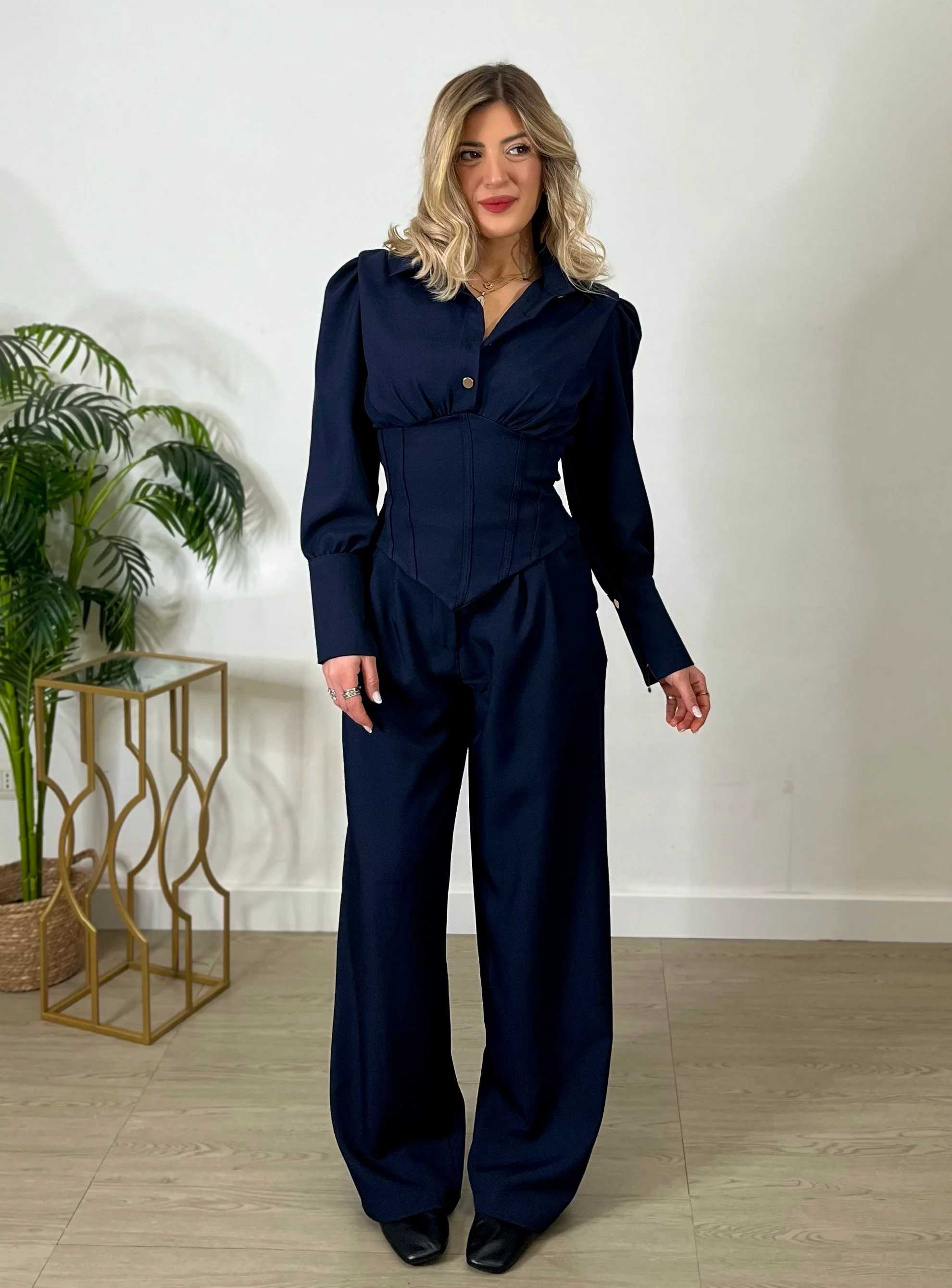 Tailleur con corpetto strutturato e pantalone coordinato. Corpetto con bottoni frontali, spalline imbottite e fascia elastica sul retro per una vestibilità confortevole. Pantalone a gamba morbida e ampia. Taglia unica, veste dalla S alla L.