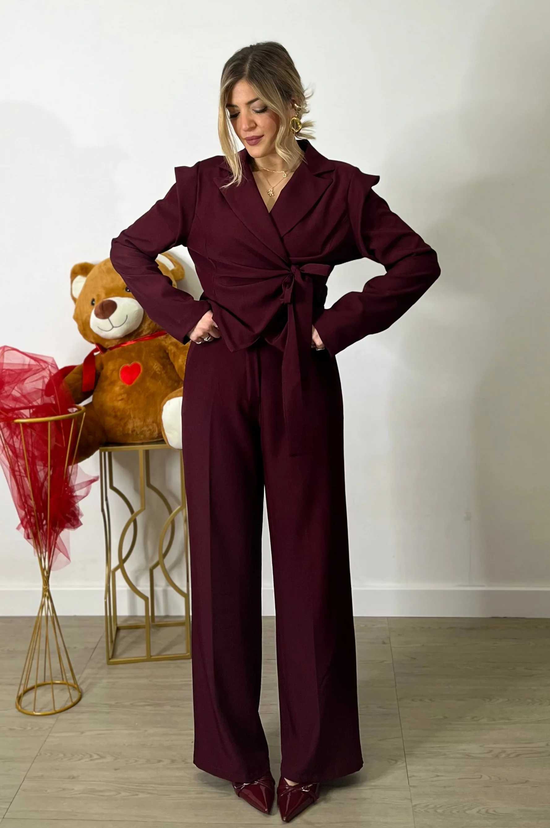 Tailleur composto da blazer crop a portafoglio con chiusura a nodo laterale e laccetto interno, abbinato a pantalone classico con chiusura a bottoni e zip. Taglia unica, veste dalla S alla L.