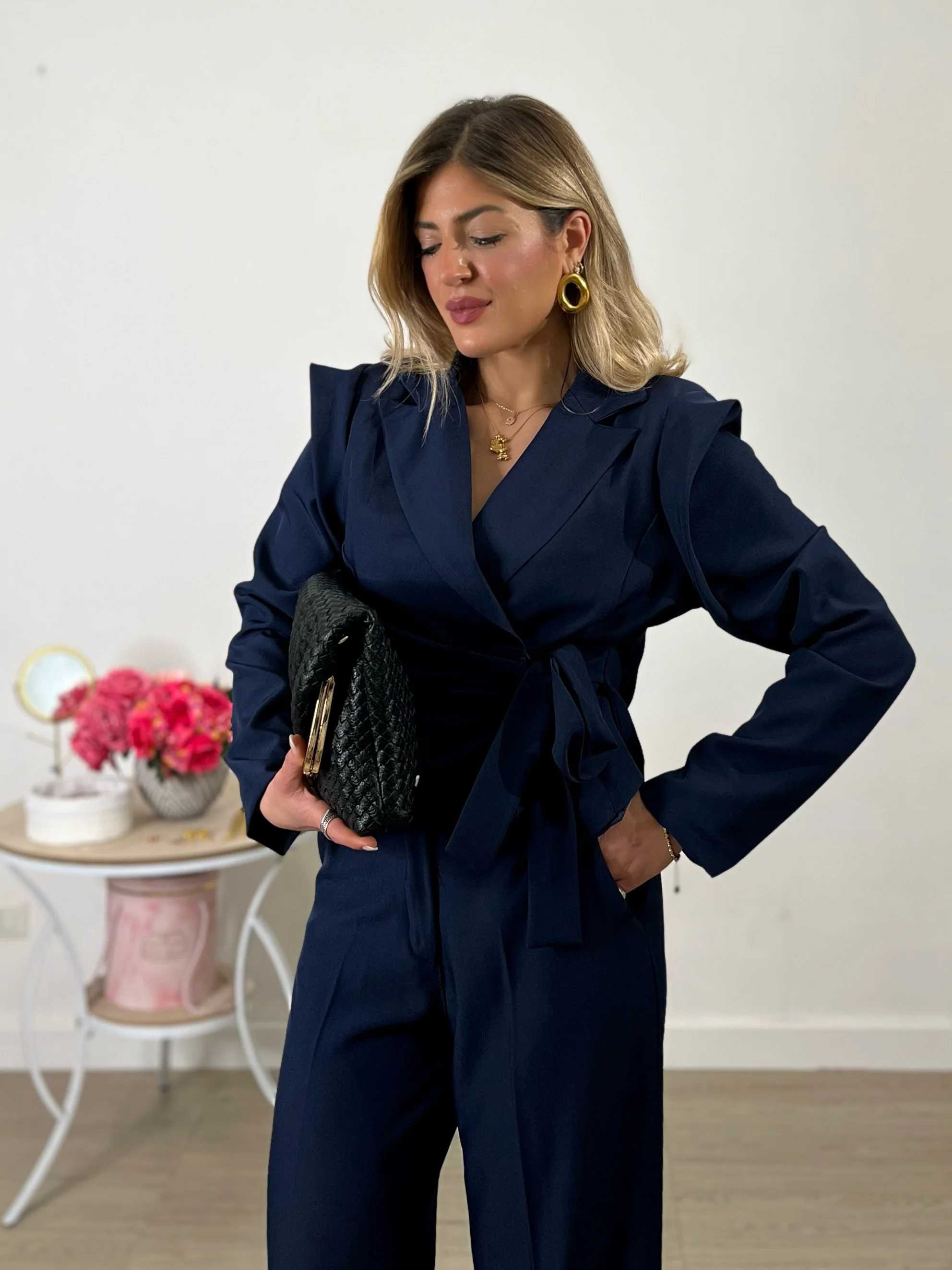 Tailleur composto da blazer crop a portafoglio con chiusura a nodo laterale e laccetto interno, abbinato a pantalone classico con chiusura a bottoni e zip. Taglia unica, veste dalla S alla L.