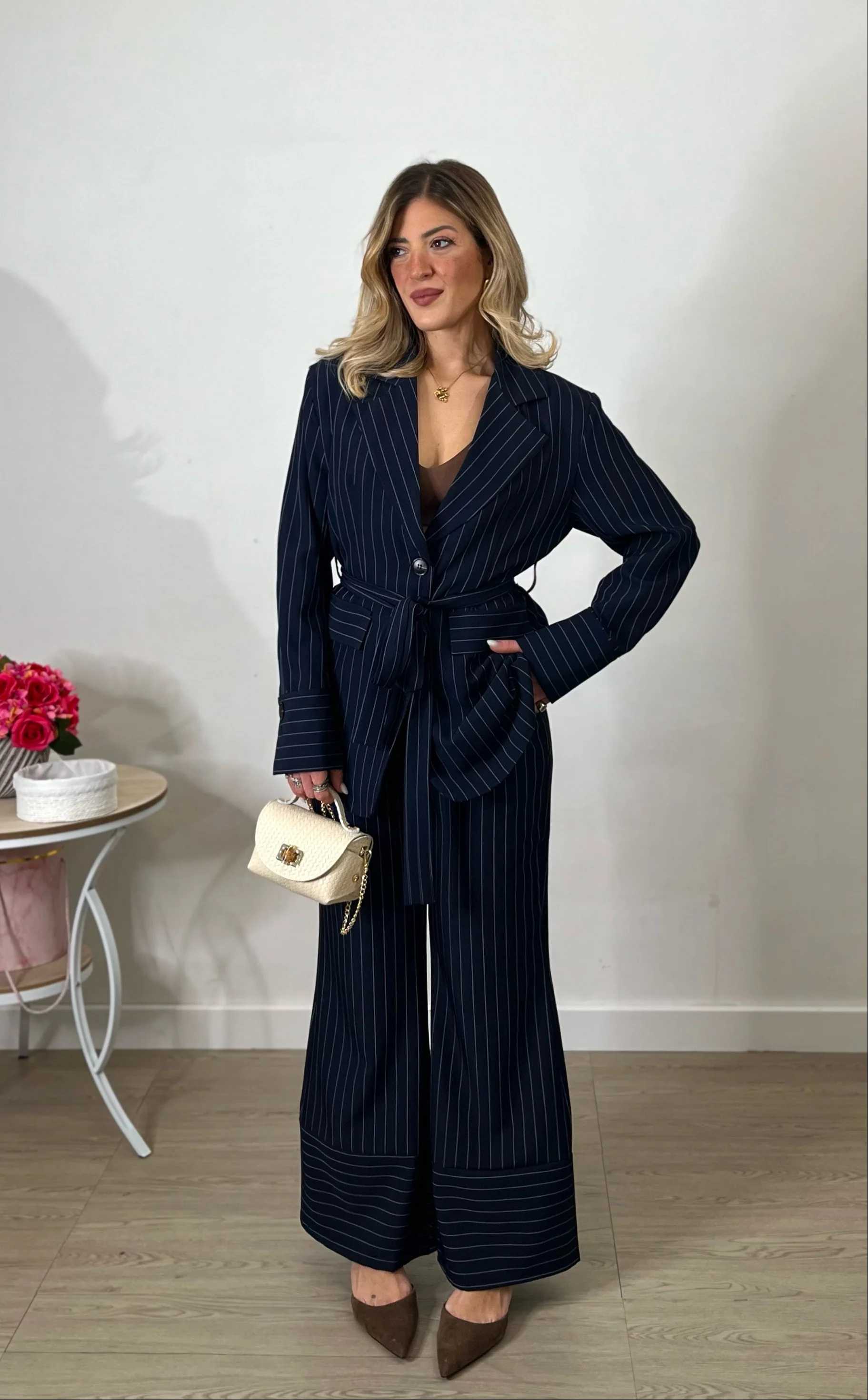 Completo 2 pezzi composto da: Giacca strutturata con fusciacca e bottoni frontali. Pantalone con chiusura a bottone e cerniera. Taglia unica, adatta dalla 38 alla 44.