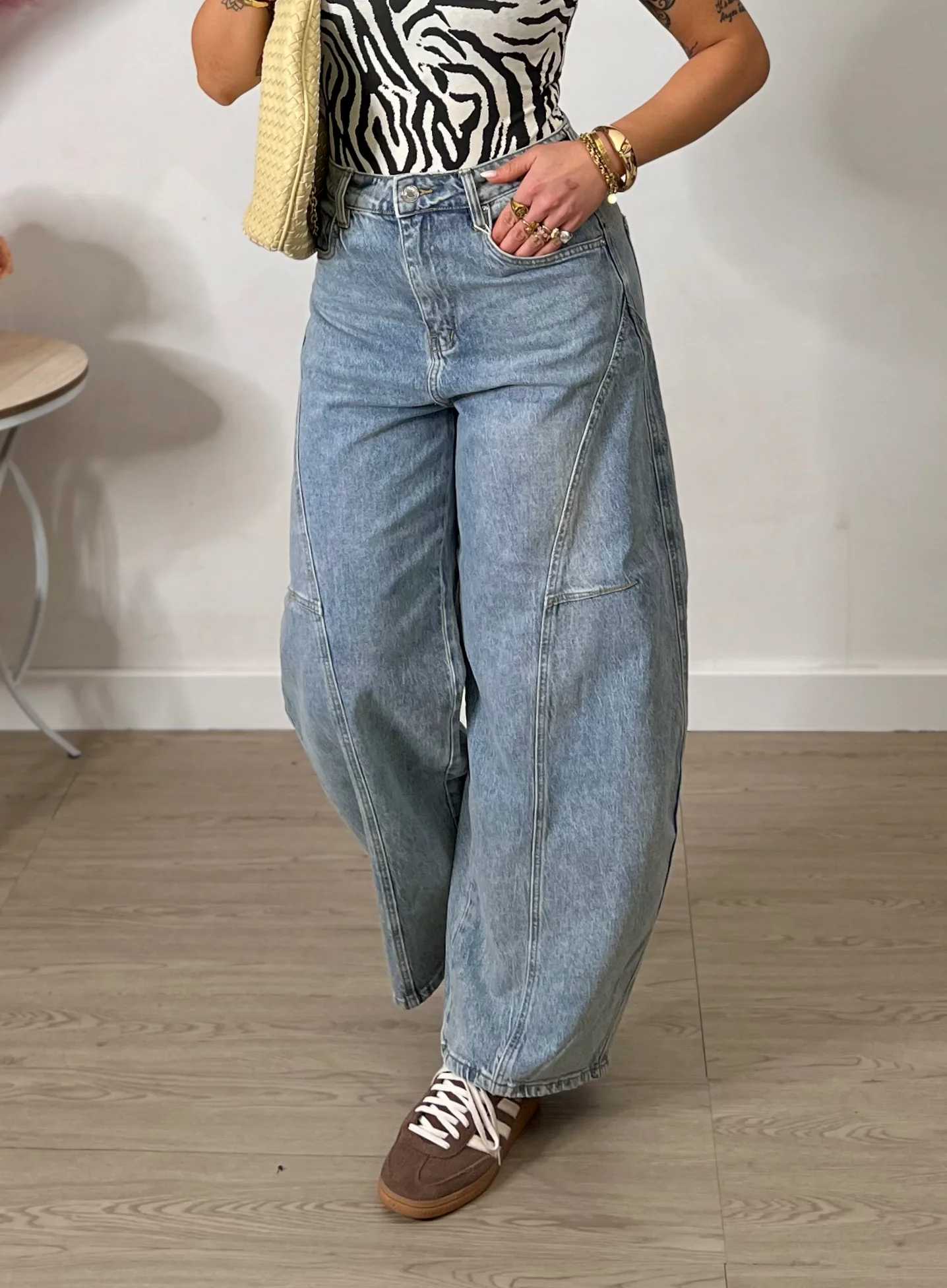 Jeans modello balloon e vestibilità regolare. Giulia in foto indossa la solitamente la taglia M.