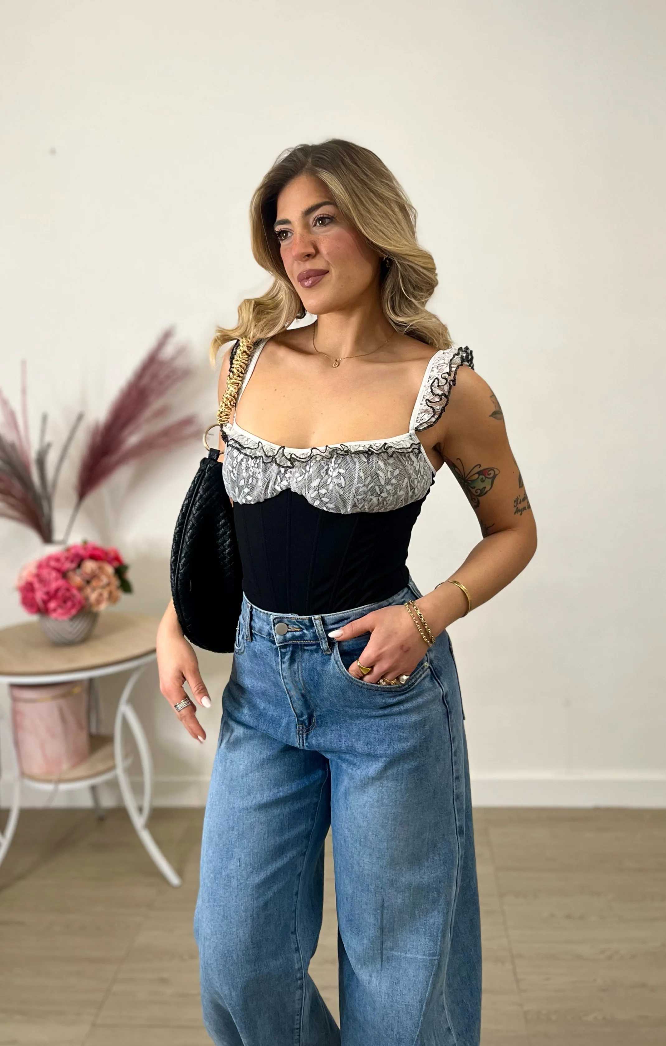 Corpetto con pizzo bianco a contrasto sulla parte frontale e spalline. Spalline con dettagli e tessuto elasticizzato per una vestibilità comoda e aderente. Non presenta gancetti o cerniere. Veste dalla 1ª alla 4ª.
