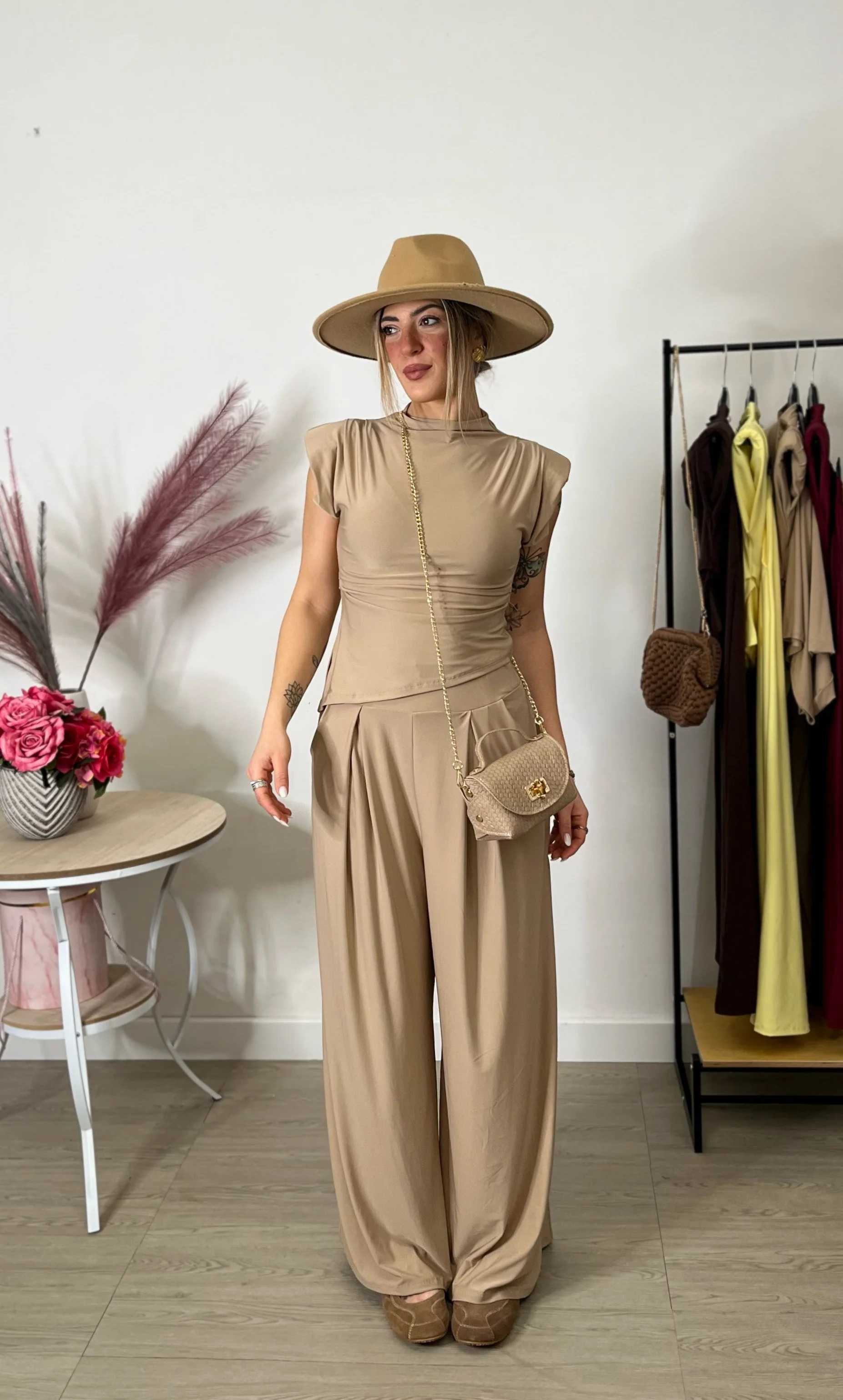 Coordinato elasticizzato e confortevole, composto da pantalone con elastico in vita e top con spalline imbottite e taglio asimmetrico. Taglia unica, veste dalla S alla L.