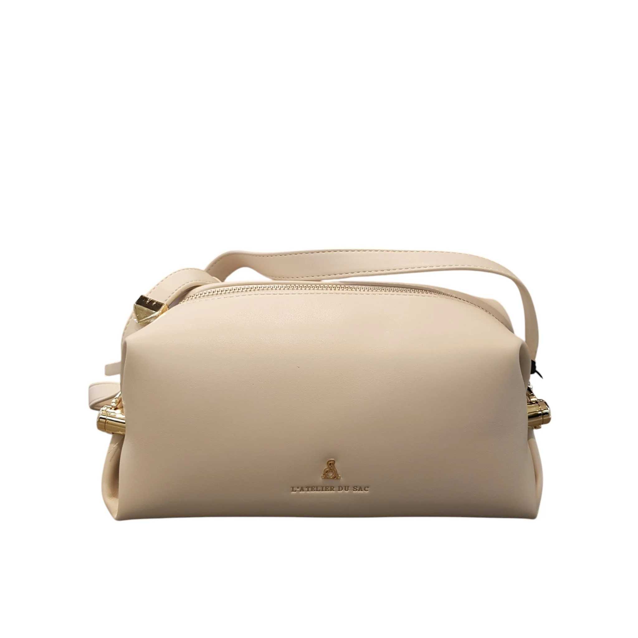 Borsa a spalla con logo oro chiaro L'Atelier du Sac con manici in ecoleather e chiusura zip. Art.1072 DIMENSIONI: 26CM X 12CM X 12CM