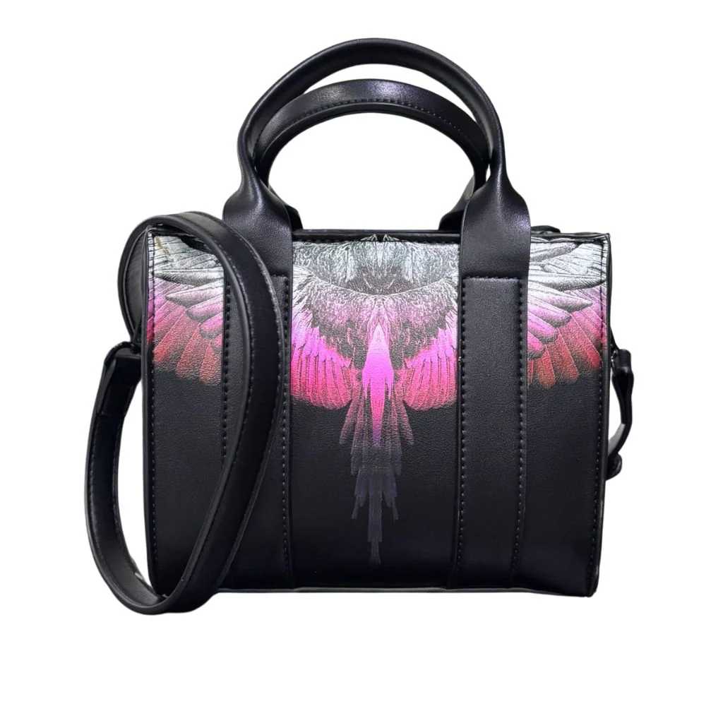 La Mini Tote Bag Wings Rosa di County of Milan segna un cambio di formato nella famiglia Wings: non più un borsello, ma una mini tote bag dalla struttura rigida e dalla silhouette elegante, pensata per chi vuole portare l'iconografia del brand in una forma più femminile e raffinata. La stampa Wings Rosa si dispiega sull'intera superficie frontale con una palette magnetica: il grigio/argento delle piume superiori sfuma verso un rosa acceso e fucsia intenso, dissolvendosi in una coda di rosso e viola che si perde nel nero del fondo, come braci che si spengono nel buio. Il contrasto tra la struttura sobria e geometrica della borsa e la carica cromatica della stampa crea un equilibrio perfetto tra eleganza e personalità. Realizzata in ecopelle liscia nera, i doppi manici rigidi e la tracolla rimovibile e regolabile la rendono versatile in ogni situazione, portata a mano per un look più strutturato, a tracolla per la massima libertà di movimento. Misure: 18 x 15 x 11 cm