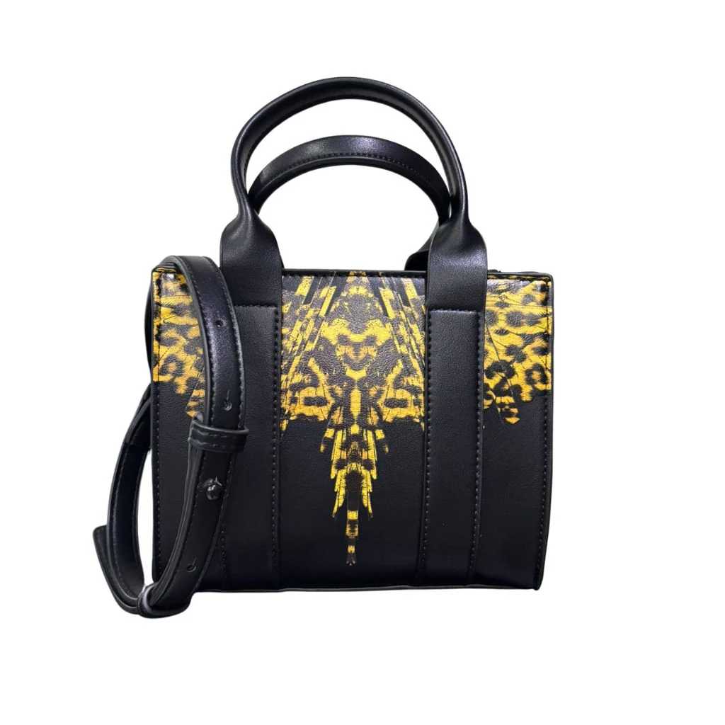 La Mini Tote Leopard Wings di County of Milan è il connubio perfetto tra streetwear contemporaneo e lusso accessibile. Il suo design è inconfondibile: uno sfondo nero intenso in ecopelle di alta qualità, impreziosito da una stampa esclusiva che fonde ali di farfalla in oro brillante e dettagli animalier leopardati, per un effetto visivo che cattura l'attenzione ad ogni passo. Manici: Doppio manico rigido superiore per il porto a mano Tracolla: Regolabile e rimovibile, per un utilizzo versatile a spalla o a mano Chiusura: Zip superiore Formato: Mini Tote — compatta ma capiente, perfetta per il quotidiano Misure: 18 x 15 x 11 cm