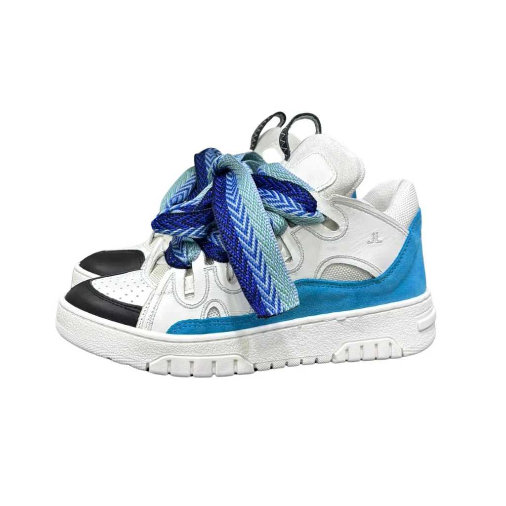 Sneakers Cambridge Jammers London in pelle bianca con inserti in camoscio azzurro e dettagli neri. Il laccio oversize intrecciato bicolore blu/celeste è il vero protagonista del design, esaltando un'estetica urban luxury dal carattere bold. Suola chunky bianca con battistrada pronunciato per un look che unisce comfort e stile street.