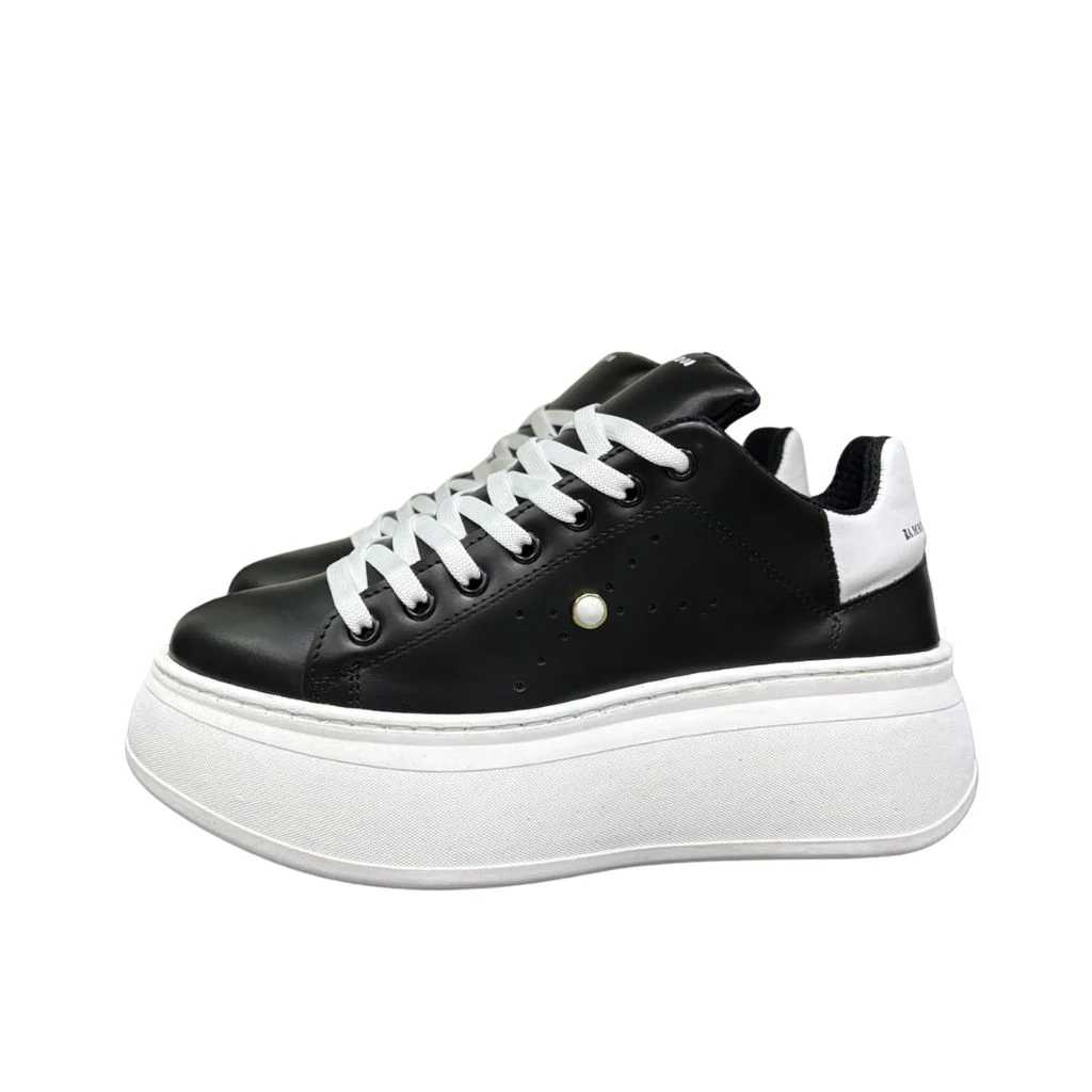 Sneakers Alexa Ludo Jammers London in pelle nera con tab posteriore bianco e lacci bianchi a contrasto. Il dettaglio gioiello, una perla applicata sulla tomaia, aggiunge una nota preziosa e femminile a un silhouette bold. La maxi suola platform (6cm) bianca allunga la figura e firma il look con un'estetica contemporanea tra sport e luxury.