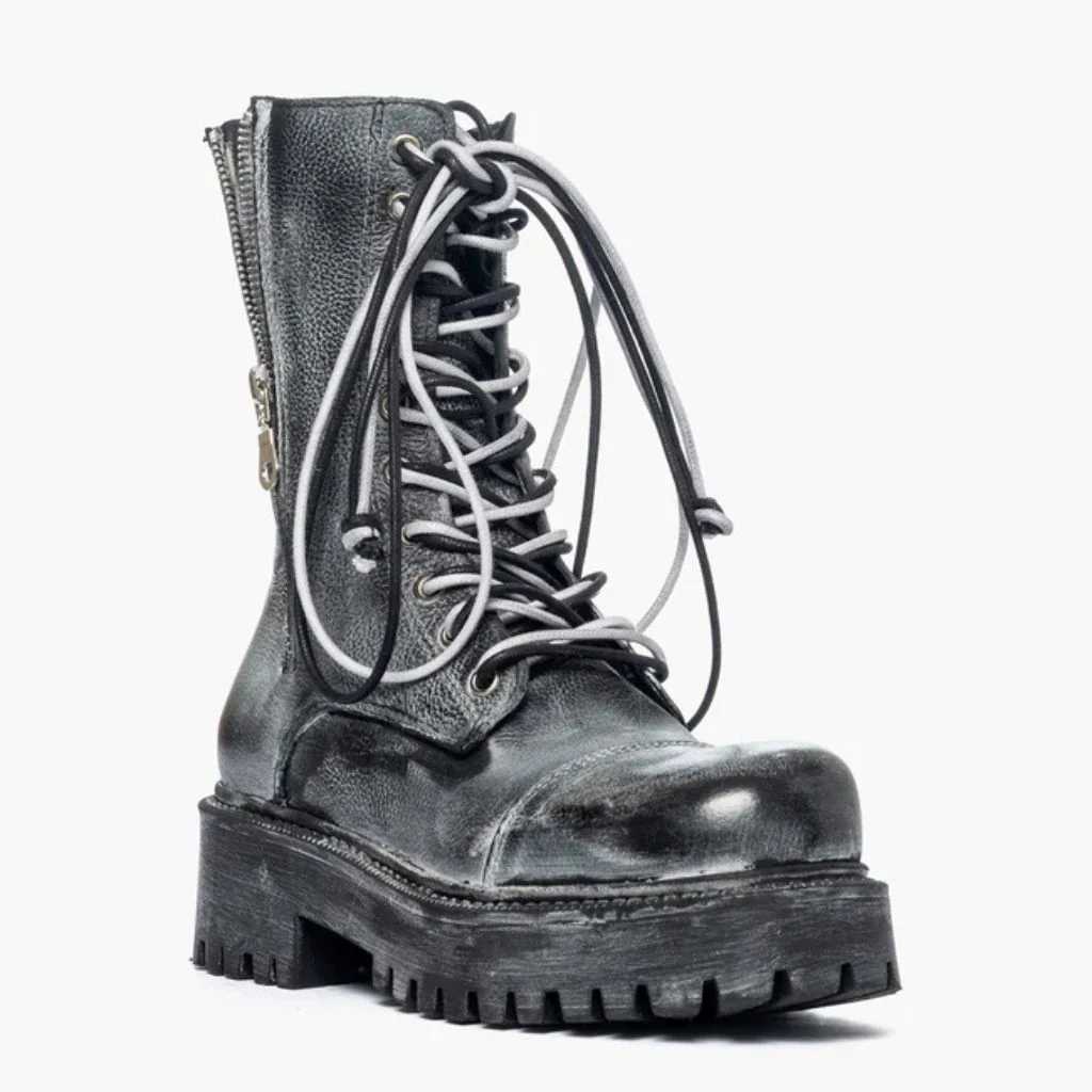 Anfibi in nabuk nero lavorato a mano con spazzolatura effetto vintage in bianco. Il modello si distingue per la doppia zip laterale e il doppio laccio bicolore, che permettono di personalizzare completamente la vestizione: si può optare per un fit classico, stretto e aderente alla caviglia, oppure per un look più morbido e largo, seguendo le tendenze più attuali. Le punte dal design ricercato completano l'estetica unica di questo anfibio. Suola in gomma nera spazzolata, altezza 5 cm. Nota: La consegna avviene in 5 giorni lavorativi