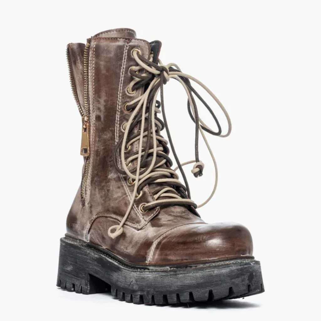 Anfibi in pelle marrone lavorata a mano con spazzolatura effetto vintage in beige. Il modello si distingue per la doppia zip laterale e il doppio laccio bicolore cerato, che permettono di personalizzare completamente la vestizione: si può optare per un fit classico, stretto e aderente alla caviglia, oppure per un look più morbido e largo, seguendo le tendenze più attuali. Le punte dal design ricercato completano l'estetica unica di questo anfibio. Suola in gomma nera spazzolata, altezza 5 cm. Nota: La consegna avviene in 5 giorni lavorativi