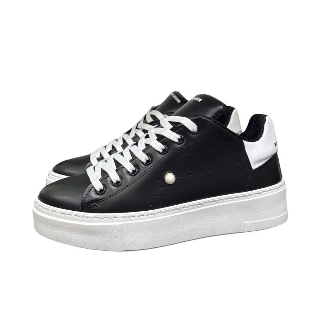Un classico senza tempo reinterpretato con carattere. Le sneakers Perla di Jammers London si presentano in una versione in pelle nera, valorizzata da dettagli raffinati: le perforazioni a stella sulla fiancata, il bottone gioiello dorato e il contrasto del tallone in pelle bianca lucida con logo brandizzato. Il design pulito e minimalista è arricchito da lacci piatti bianchi, impunture a vista e un'imbottitura interna che garantisce comfort per tutto il giorno. Il vero punto di forza? La suola platform extralight (4cm) leggera come una piuma ma con un'altezza che allunga la silhouette e dona quel tocco di personalità in più ad ogni outfit, dai look casual alle combinazioni più ricercate.