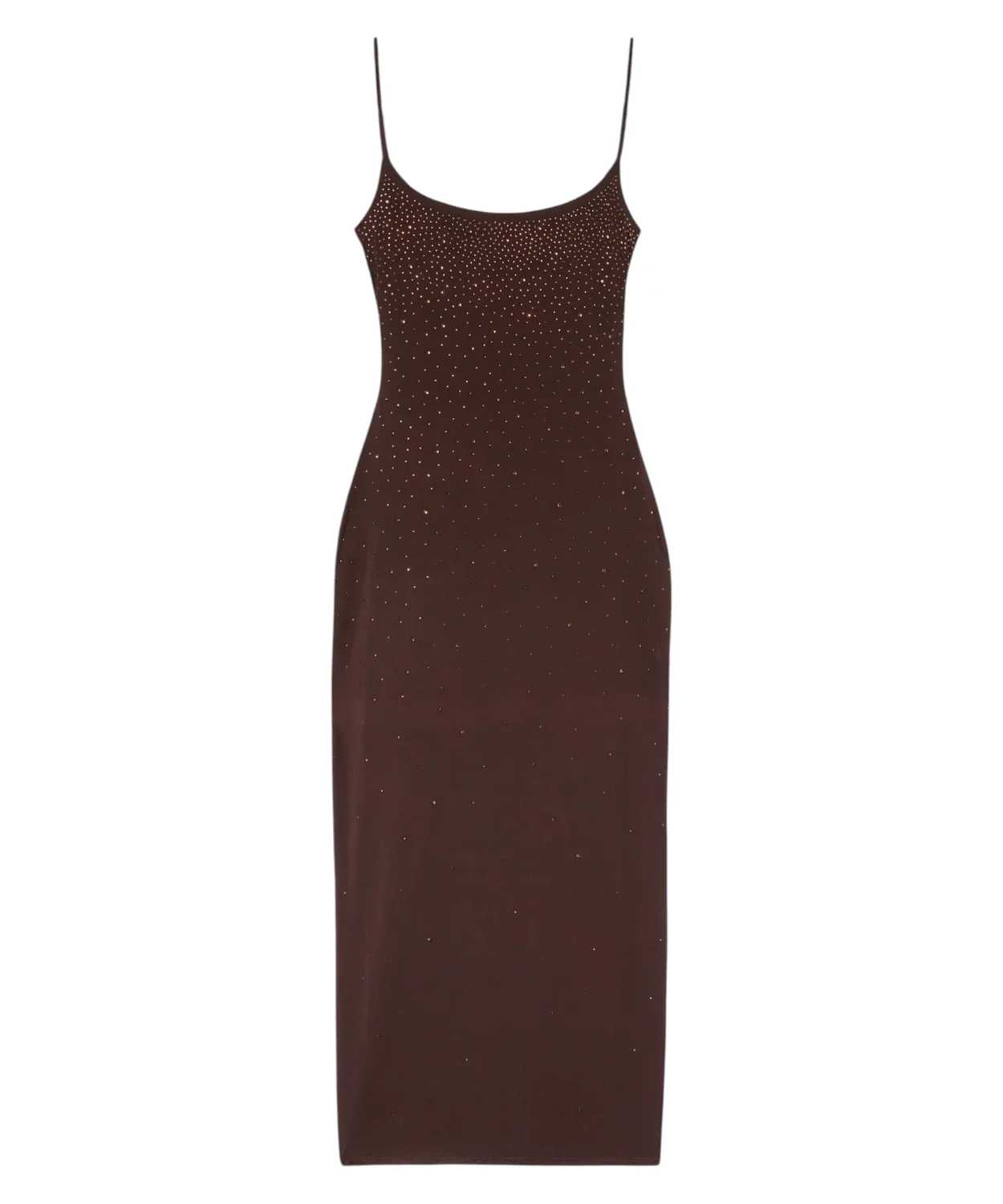L’abito lungo Evy interpreta un’eleganza femminile e luminosa con una linea essenziale pensata per valorizzare la silhouette. Realizzato in tessuto elasticizzato, assicura comfort e vestibilità aderente, accompagnando naturalmente le forme con un fit sensuale e armonioso. Il design marrone tinta unita è arricchito da strass effetto degradé, dettagli luminosi che creano raffinati punti luce sulla superficie del capo e donano profondità all’estetica del modello. Lo scollo dritto definisce la parte superiore con pulizia ed equilibrio, mentre le spalline sottili regolabili permettono di personalizzare la vestibilità con precisione. La linea aderente e la lunghezza alla caviglia rendono questo abito lungo marrone particolarmente adatto a look eleganti, serali o da occasione speciale, mantenendo un’immagine sofisticata e contemporanea. Il capo non è foderato e, grazie al tessuto elasticizzato, offre una vestibilità che segue il corpo con naturalezza. Per la scelta della taglia, si consiglia di considerare la natura aderente del modello e l’elasticità del tessuto.