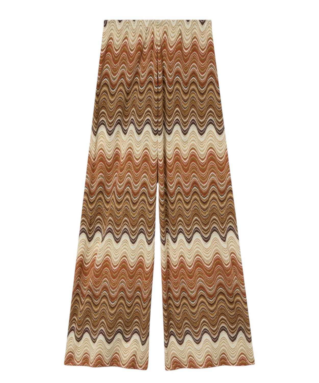 Il pantalone lungo Amalia interpreta uno stile rilassato e sofisticato, perfetto per completare look estivi e leisure con un tocco ricercato. Realizzato in maglia raschel leggera ed elasticizzata, offre comfort e libertà di movimento, accompagnando la silhouette con una vestibilità morbida e naturale. Il design con motivo a onde nei toni del marrone definisce il capo con un’estetica grafica distintiva, valorizzata dall’effetto degradé che dona profondità e dinamismo alla superficie. I dettagli in filo lurex aggiungono una nota luminosa e raffinata, arricchendo il modello con un accento elegante ma discreto. La vita elasticizzata assicura una vestibilità comoda e regolare, mentre la gamba ampia contribuisce a creare una linea fluida e contemporanea, ideale per chi desidera un pantalone versatile, confortevole e d’impatto. Perfetto da abbinare a top coordinati, maglie leggere o capi beachwear, il pantalone Amalia è pensato per accompagnare con stile le occasioni più rilassate.
