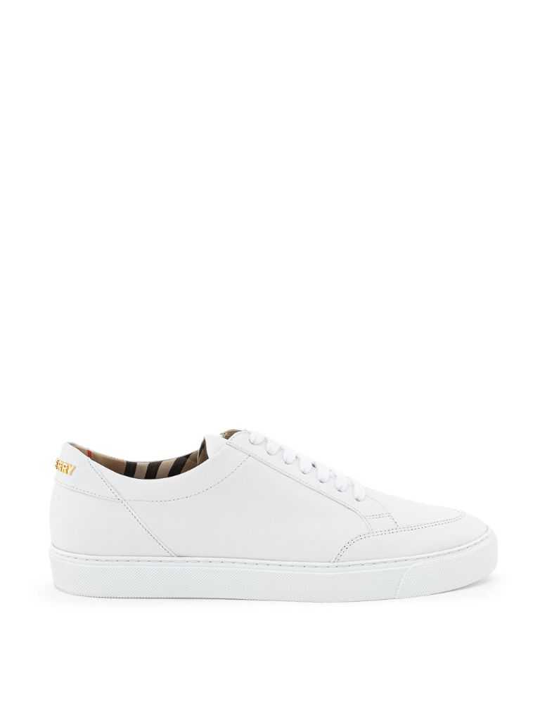 Sneaker in Pelle Bianca Burberry. Allacciatura frontale con lacci bianchi, punta tonda, impunture tono su tono, interno foderato con Burberry check. Logo metal dorato applicato sul retro. Composizione: 100% Pelle-Sku interno:24GIU90Nessuna informazione disponibile