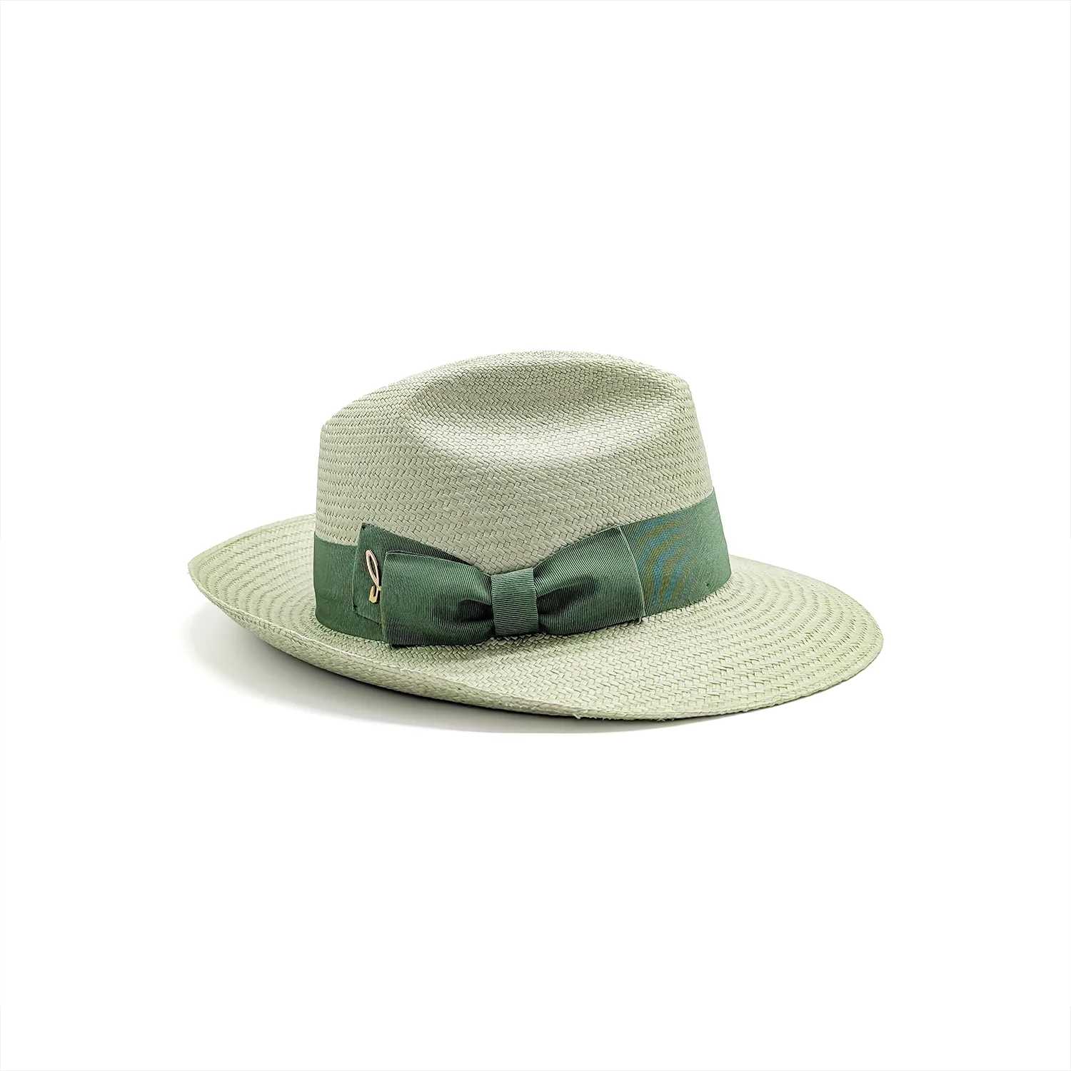 La nostra Dalida è una fedora che ha deciso di essere sia elegante che quotidiana, e ci riesce con il verde oxygen — una tonalità che porta dentro di sé sfumature di grigio, rendendola più profonda di quanto sembri a prima vista. Il Panama Cuenca è sagomate con cura, la cinta grosgrain verde giada e il fiocco Doria completano il cappello con un tocco di personalità. Logo in ottone dorato. Non serve un'occasione speciale per indossarla — basta voler stare bene.