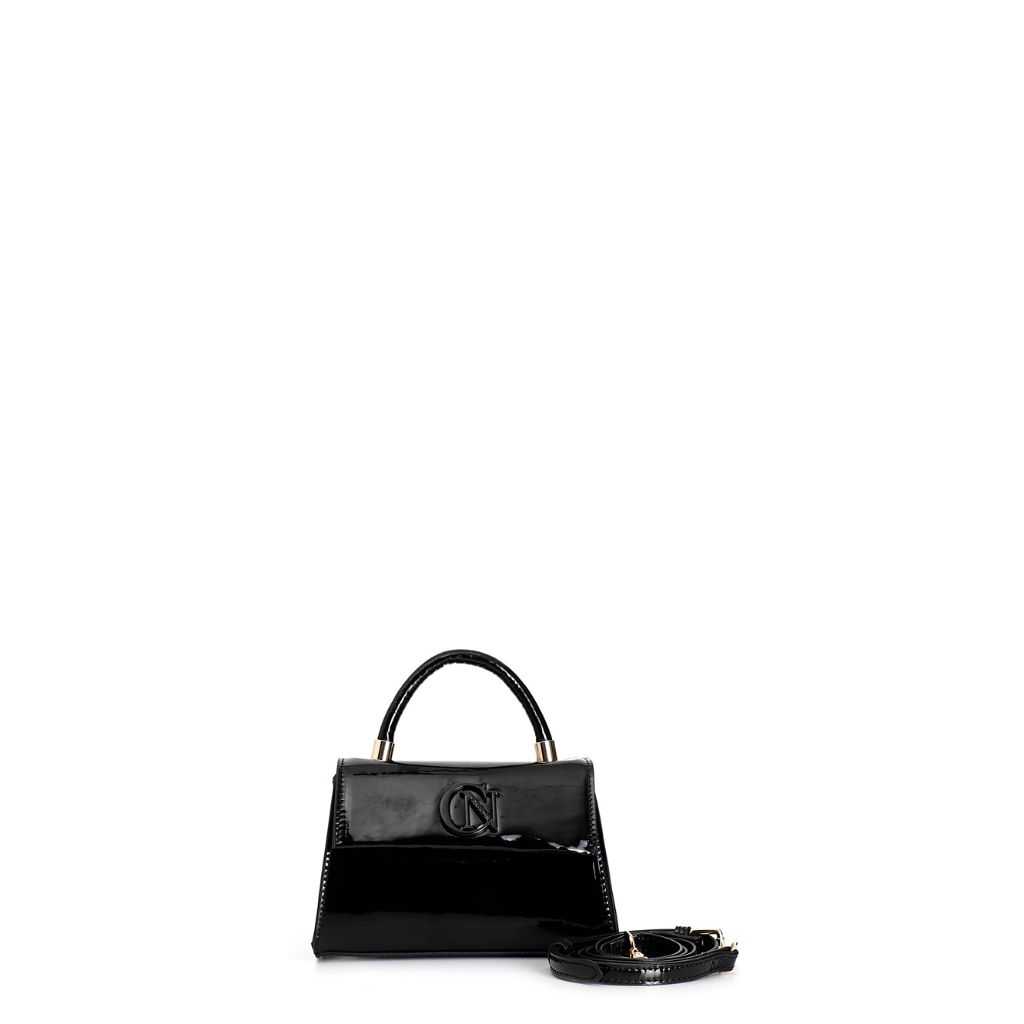 Minibag rigida effetto vernice con manico e pattina. logo cafènoir in tono alla borsa. chiusura a calamita. borsa dotata di tracolla.
