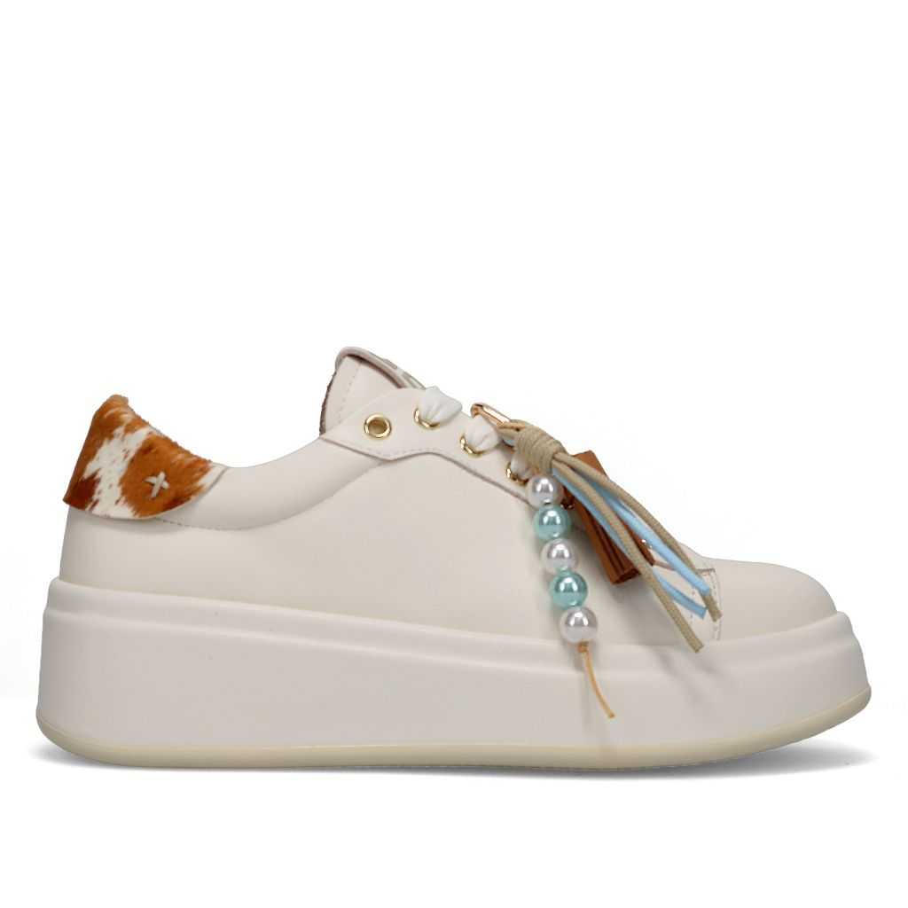 Sneakers GIO+ in pelle di vitello di color crema caratterizzata da occhielli in metallo, targhetta sulla linguetta con il logo in laminato e accessori di strass infilati sui lacci piatti in cotone. Il fondo platform è in leggerissima gomma EVA in tinta di colore con la tomaia e rialza il tallone dal suolo di 5 cm. Internamente è foderata in pelle. Soletta interna estraibile.