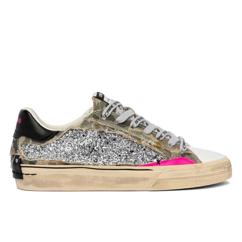CRIME LONDON - Sneaker da donna Crime London in canvas camouflage e glitter argento