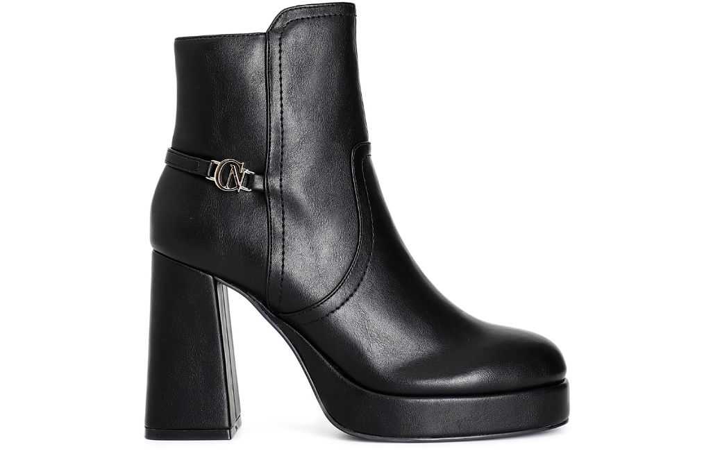Tronchetto da donna in similpelle con particolare accessorio cafènoir. plateau di 22 mm e tacco alto 100 mm. forma stondata. cerniera interna nella parte interna della calzatura. il soletto è in pelle. il tutto dona equilibrio tra altezza bellezza e comodità.