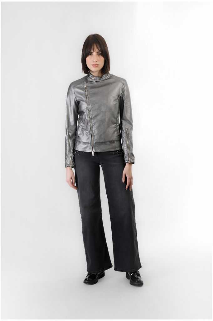 Giubbino modello chiodo con zip frontale su maniche. realizzato in similpelle dall'effetto laminato. tasche laterali e chiusura trasversale a zip. la fodera è imbottita e trapuntata. capo versatile da aggiungere al tuo guardaroba.