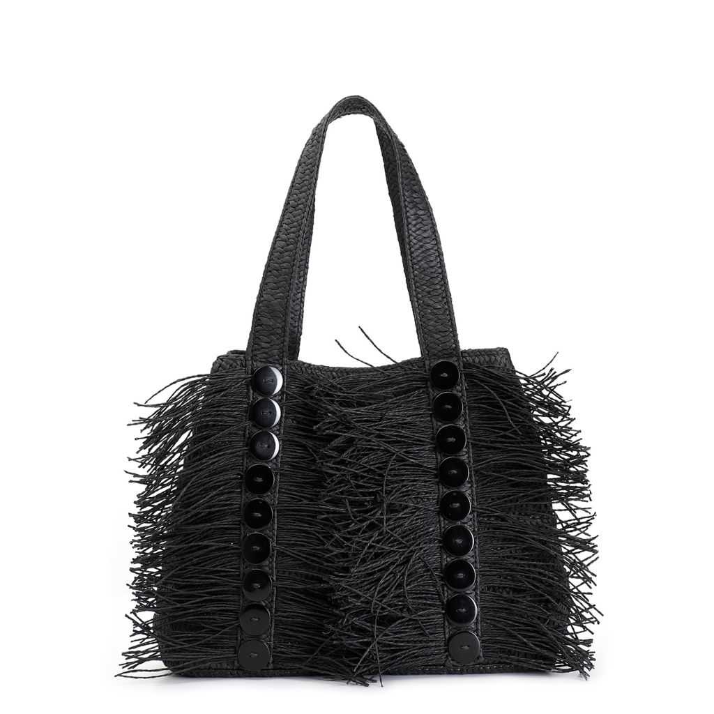 shopping bag in rafia con frange e bottoni decorativi nero