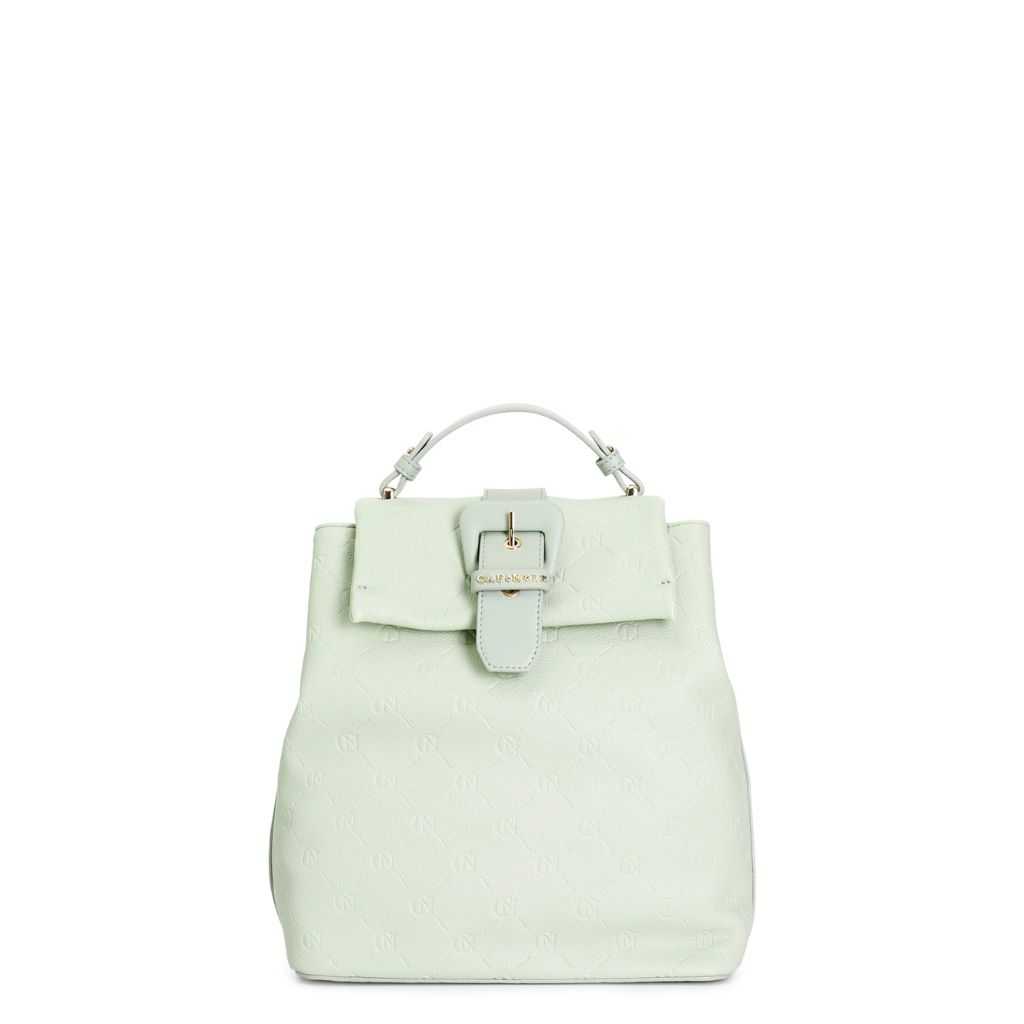 Zaino con pattina in stampa monogram chiusura a fibbia rivestita manico superiore tasca posteriore con zip e lettering in metallo per uno stile sofisticato.