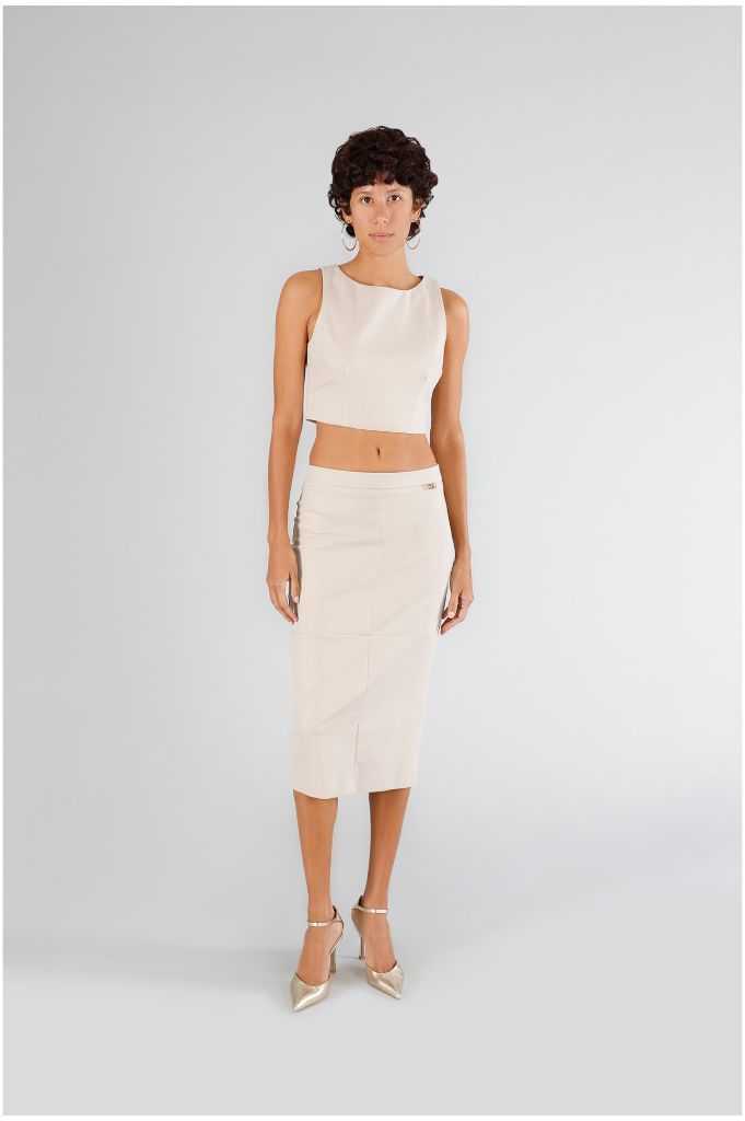 Gonna tipo tubino lunghezza midi in tessuto elasticizzato. spacco e chiusura con zip nascosta sul retro. semplice elegante moderna porta raffinatezza al tuo guardaroba di tutti i giorni. da abbinare al top in coordinato.