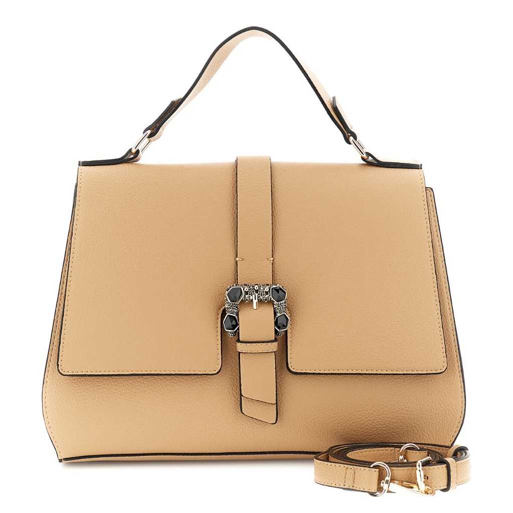 Borsa a mano in similpelle con pattina e fibbia gioiello costole a contrasto tramezze interne tasca sul retro e tracollina removibile per versatilità chic.