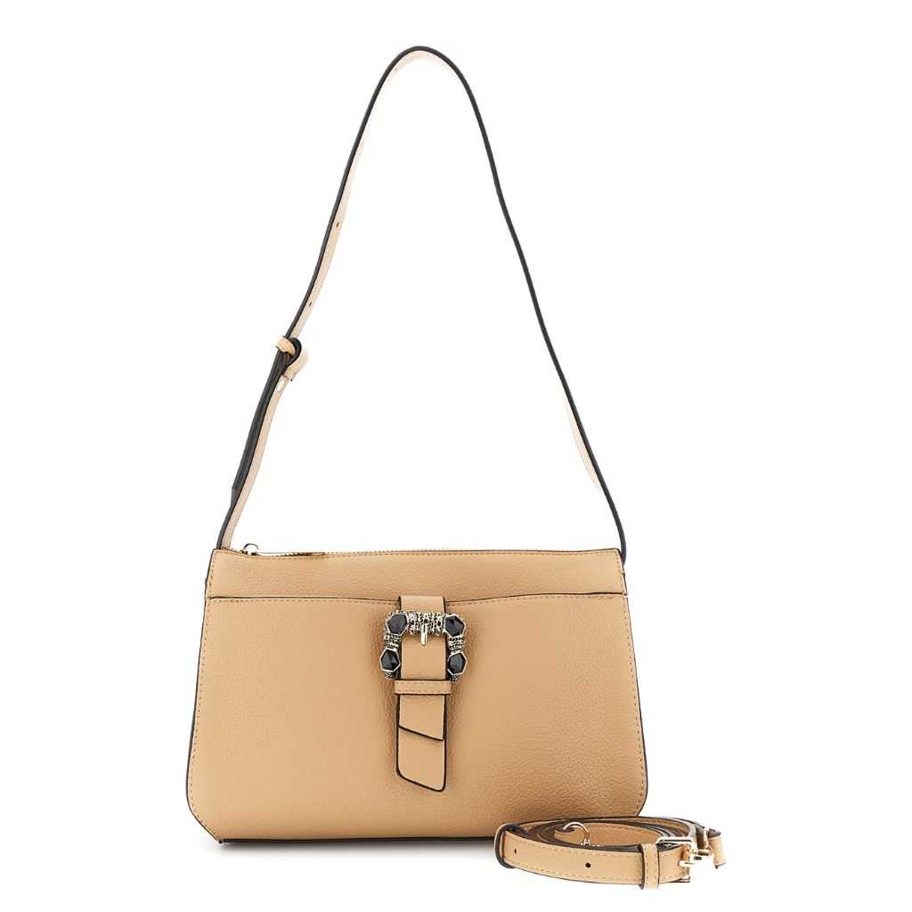 Borsa a spalla in similpelle con tasca sul davanti e fibbia gioiello. costole a contrasto e tramezze interne. tracolla regolabile e tracollina removibile.