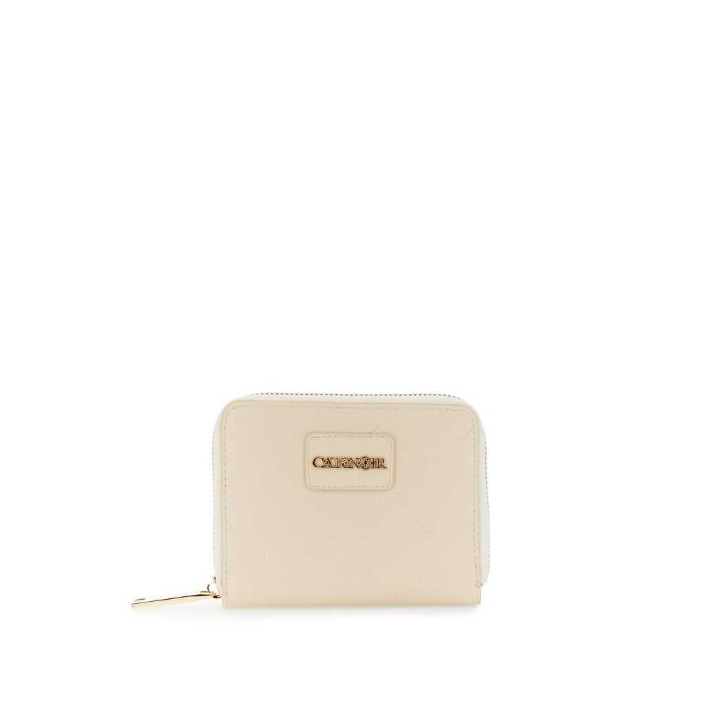 Portafoglio effetto pelle con zip stampa all over e patch con lettering in metallo.