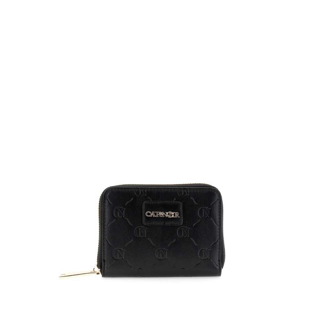 Portafoglio effetto pelle con zip stampa all over e patch con lettering in metallo.
