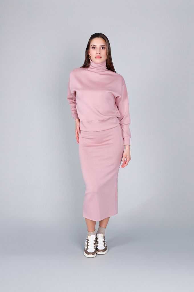 Felpa a maniche lunghe con colletto alto in scuba dalla linea essenziale e femminile. perfetta per look casual chic con un tocco moderno. vestibilità regular. la modella è alta 172 cm e indossa la taglia s.