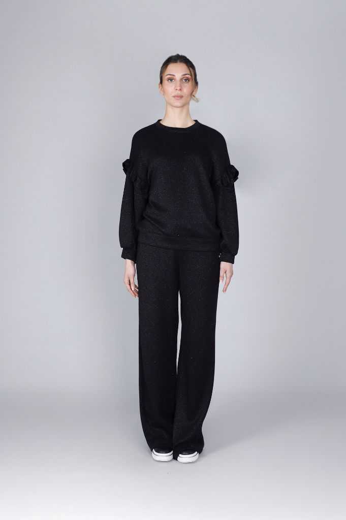 Felpa girocollo con ruches sulle maniche in felpa di viscosa e lurex dalla mano calda. un capo casual comodo funzionale e di tendenza. ideale per il tempo libero l’ufficio o le occasioni informali con un tocco di stile. la modella è alta 173 cm e indossa la s.