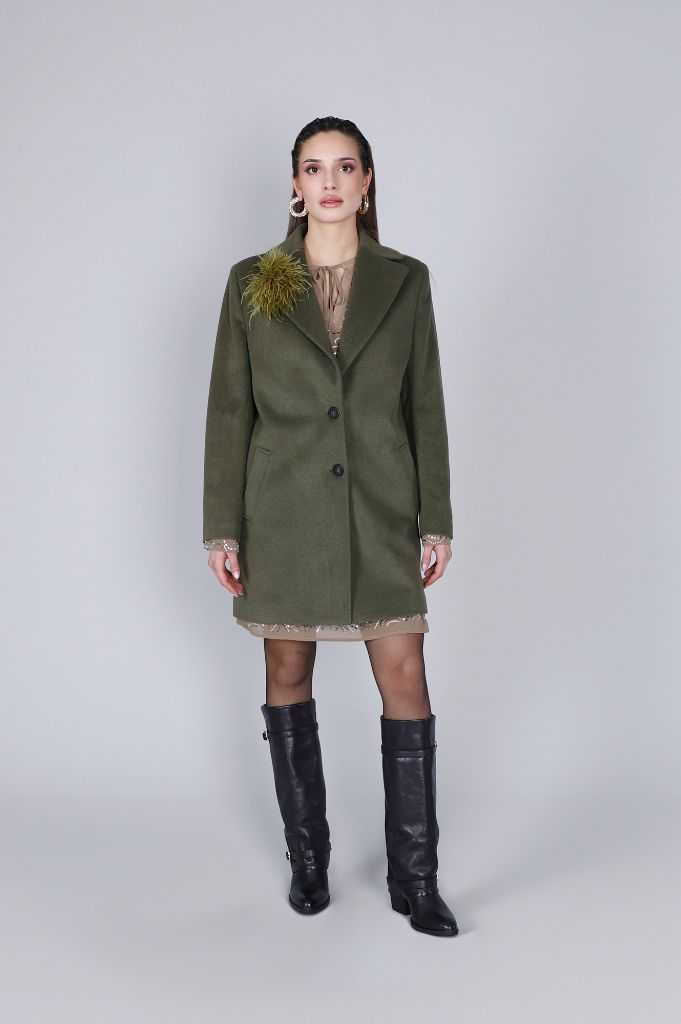 Cappotto monopetto con martingala posteriore e spilla con piuma removibile. linea pulita ed elegante ideale per un look casual chic nei mesi più freddi. vestibilità regular. la modella è alta 172 cm e indossa la taglia s.