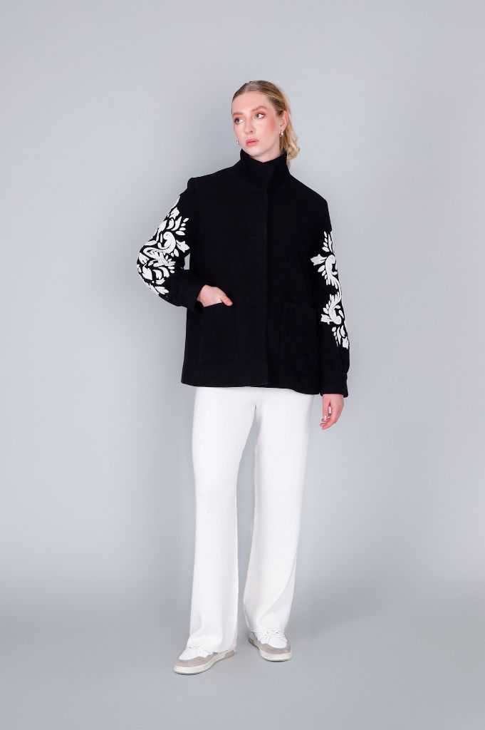 Cappotto corto da donna in tessuto caldo con esclusivo ricamo a contrasto sulle maniche. un capo casual dal design unico perfetto per look raffinati e distintivi. vestibilità regular. la modella è alta 174 cm e indossa la taglia s.