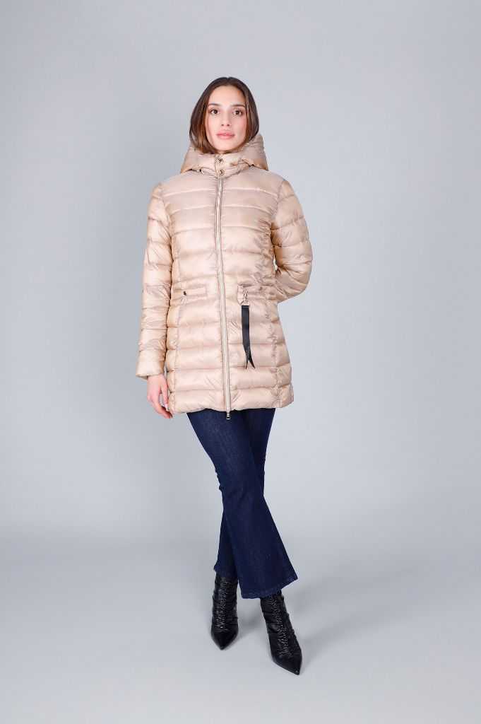 Piumino avvitato lungo al ginocchio realizzato in nylon effetto cangiante. il cappuccio staccabile e il fitting regolare rendono questo capo perfetto per uno stile casual e dinamico. la modella è alta 172 cm e indossa la taglia s.