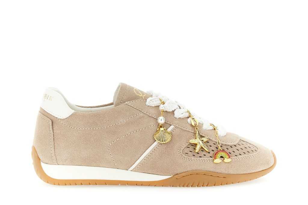 Running allacciate da donna in pelle scamosciata traforata. lacci in pizzo e charms dorati rimovibili a tema marino. fodera in tessuto soletto in pelle suola in gomma alta 2 cm. look playful e ultra glam.