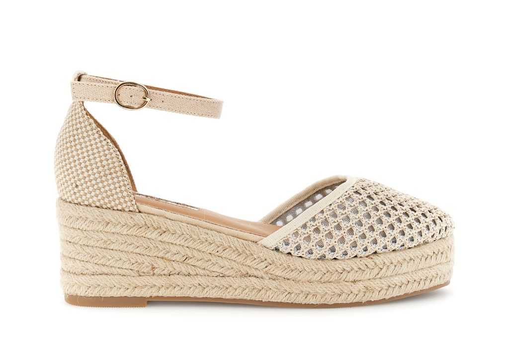 Sandali con zeppa alta 6.3 cm con tomaia in rete intrecciata e profili in tessuto punta chiusa e cinturino alla caviglia. plateau alto 2.9cm e soletto in pelle. fondo in corda a strati per un look estivo e comodo ideale ogni giorno.